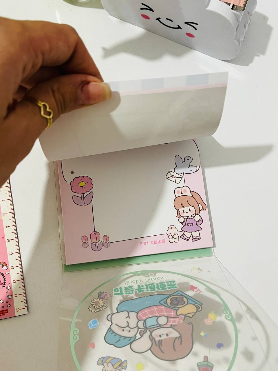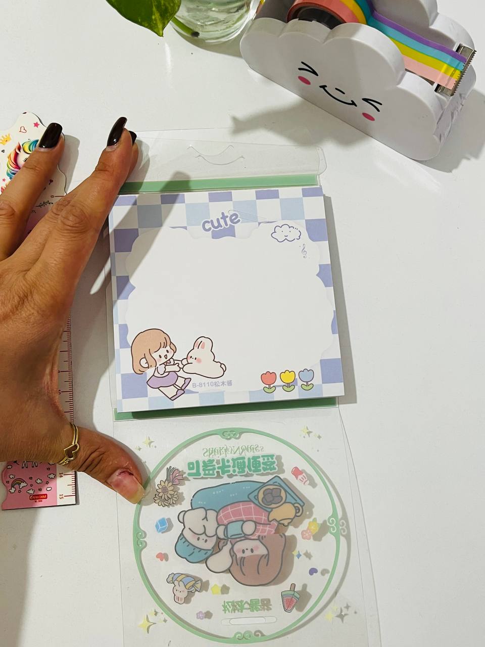 این محصول کیوت و خوشگل، نوت پد هست، برگه هایی واسه یادداشت، اما یه جلد طلقی شفاف بامزه هم دارن. صفحه ها حاشیه دار هستند و دو مدل حاشیه داره برگه هاش